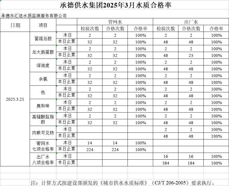 承德供水集團(tuán)2025年3月21日水質(zhì)合格率